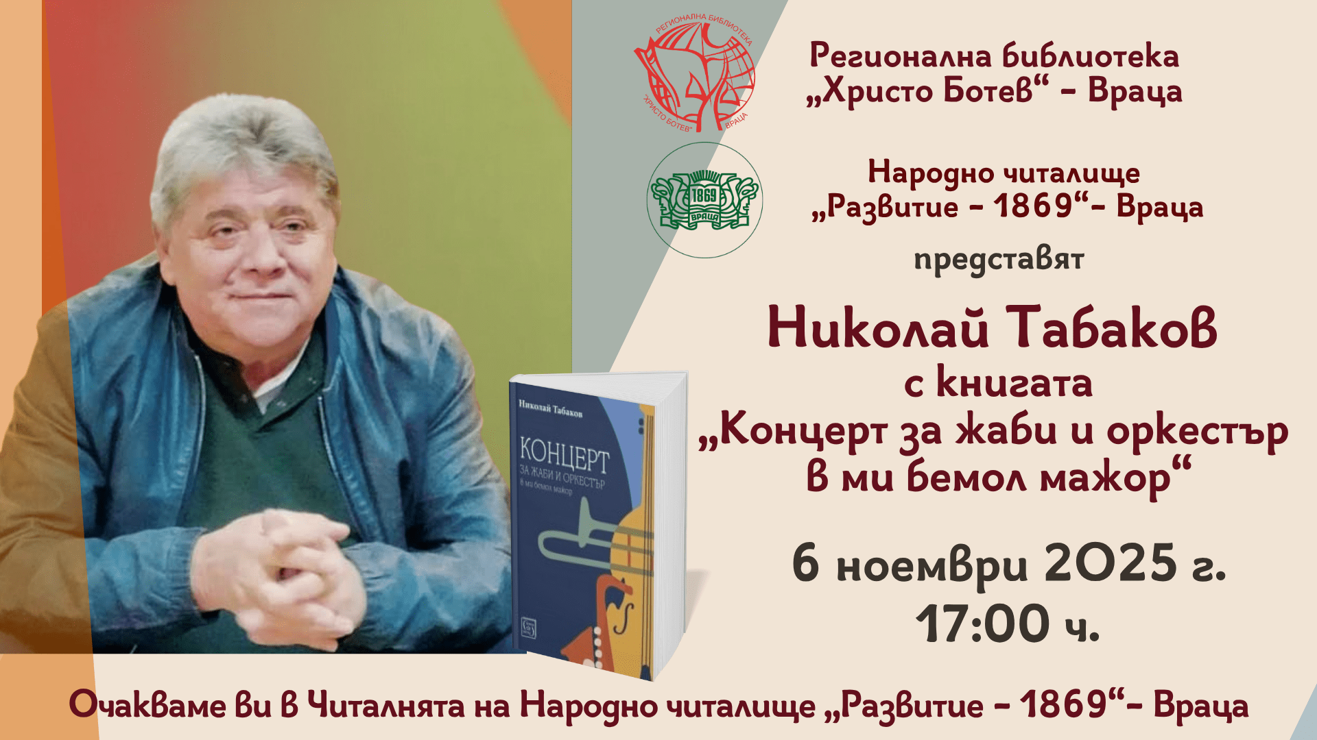 Писателят Николай Табаков представя романа си „Концерт за жаби и оркестър в ми бемол мажор“ на 6 ноември във Враца. Срещата започва от 17:00 ч. и се организира от Регионална библиотека „Христо Ботев“ и Народно читалище „Развитие – 1869“.