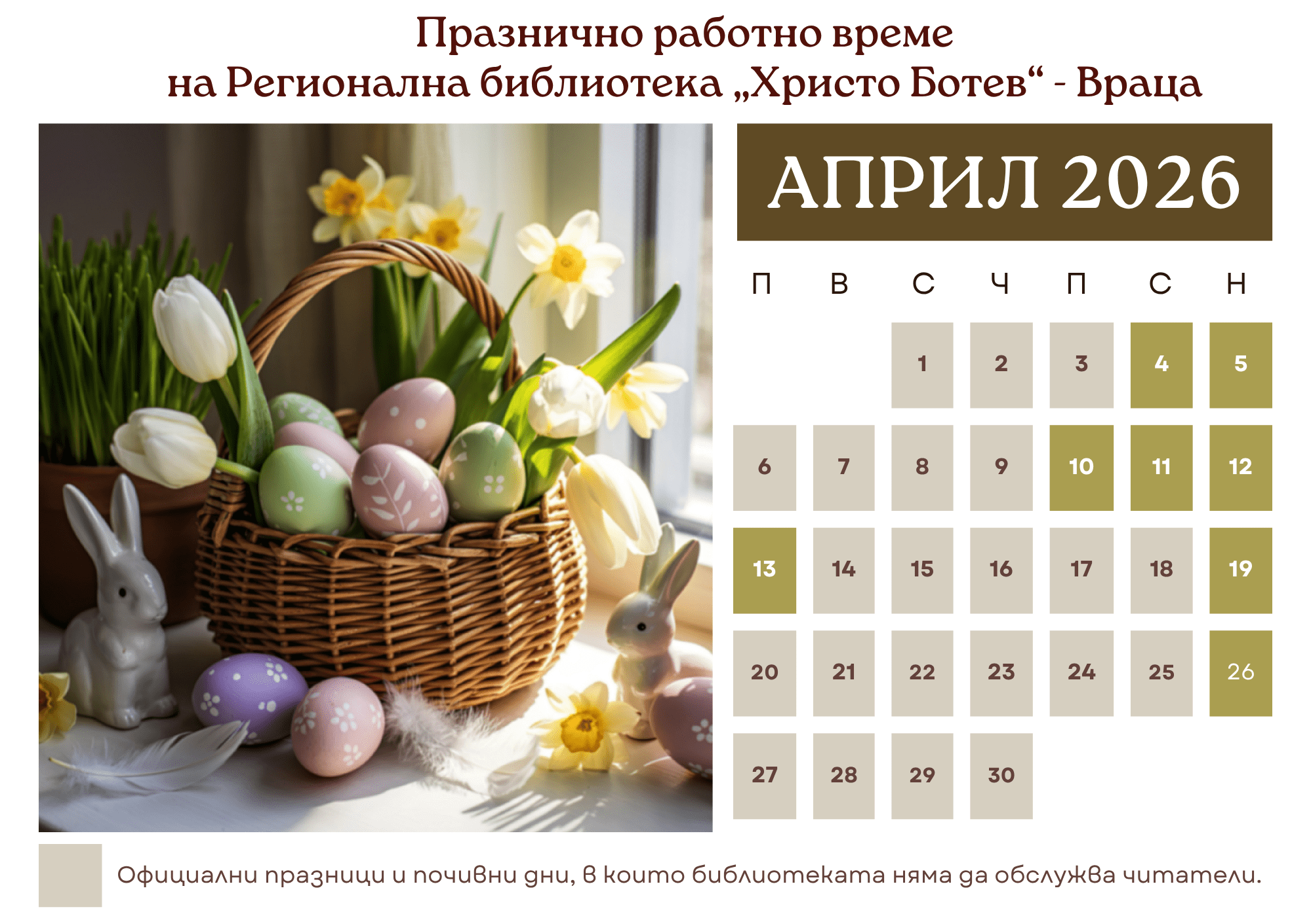 вижте как ще работи Регионална библиотека „Христо Ботев“ – Враца през април 2026 г.