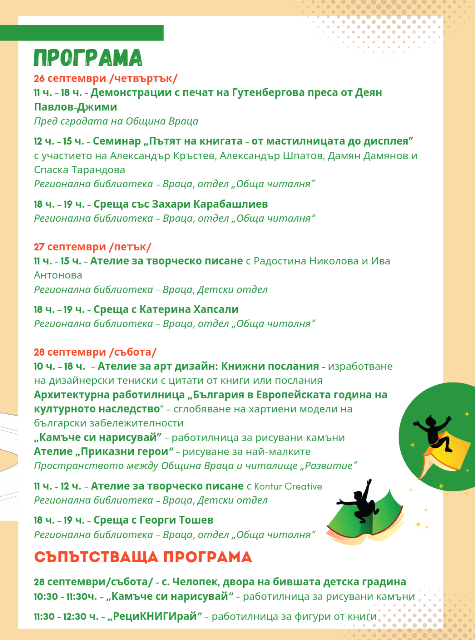 В събота, от 10 до 18 ч., в пространството между Община Враца и читалище „Развитие” ще бъдат отворени още 4 ателиета. Първото е за изработка на книжни послания върху тениски. Второто ще бъде архитектурна работилница „България в Европейската година на културното наследство“. Участниците ще могат да сглобяват хартиени модели в различни мащаби на българските забележителности: „Патриаршията на Царевец“, „Рилският манастир“, „Замъкът Баба Вида“, „Храм-паметник Св. Александър Невски“, „Крепост Градище край прохода Вратцата“. Третото е озаглавено „Камъче си нарисувай” и представлява работилница за рисуване върху камъни, в която ще се изписват буквите на глаголица. Участниците ще могат да се включват в ателиетата през целия ден. За най-малките ще бъде подготвено и място за рисуване на приказни герои.