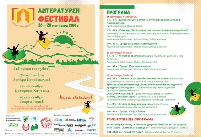 Топ автори и илюстратори гостуват на първия литературен фестивал в региона „Враца – книжен град”, който ще се проведе в периода 26 – 28 септември 2019 година.