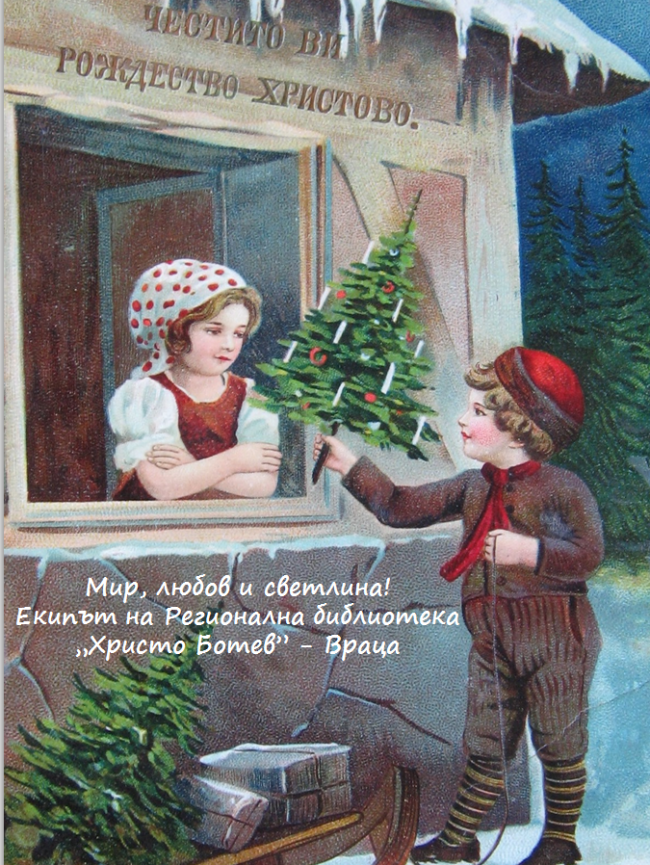 Нашият коледен поздрав е с картичка от 1908 година, от колекция „Пощенски картички” от дигиталната библиотека на Регионална библиотека „Христо Ботев” – Враца.