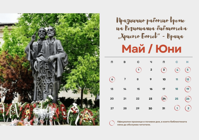 Вижте как ще работи Регионална библиотека „Христо Ботев“ – Враца през май и юни 2024 г.Не забравяйте, че отдел „Заемна за дома“ ви очаква в събота от 9:00 ч. до 14:00 ч.