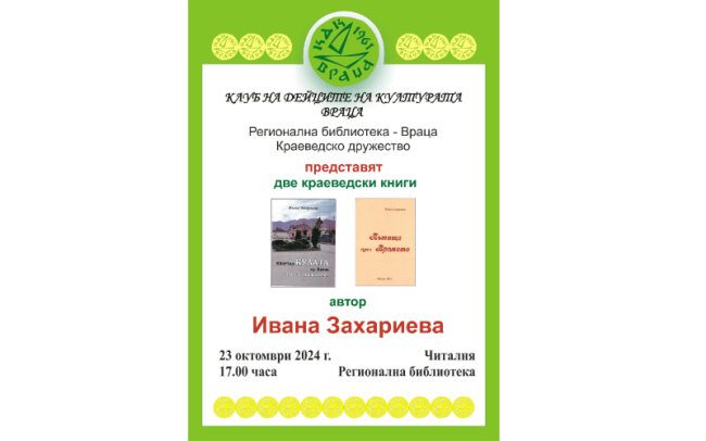 Клуб на дейците на културата, Регионална библиотека „Христо Ботев” и Краеведско дружество – Враца представят две нови книги на Ивана Захариева. Първата книга „Пътища през времето“ е сборник краеведски изследвания за село Зверино, железницата и други теми, свързани с родното село на Захариева. Втората книга е за миналото и настоящето на врачанския квартал Кулата. Ивана…