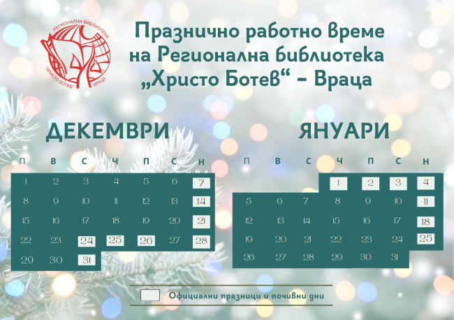 Краят на годината наближава, а с него и дългоочакваните празнични дни. Календарът ни до края на годината вече е готов – вижте как ще работи Регионална библиотека „Христо Ботев“ – Враца през декември и началото на януари 2025 г. Можете да потърсите книги в обновения ни каталог от тук: ВХОД Заповядайте!