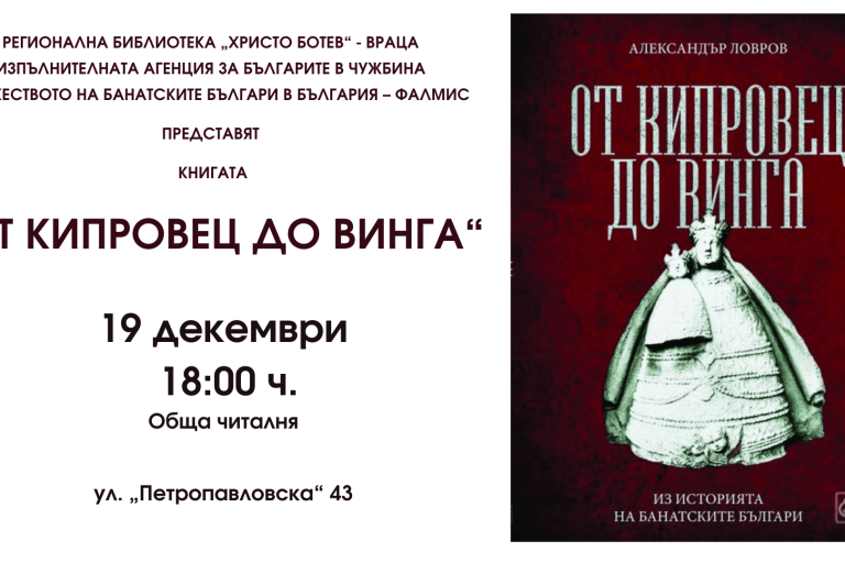 Нова книга за историята на банатските българи представя Регионална библиотека „Христо Ботев” – Враца. „От Кипровец до Винга” съдържа 13 статии, много илюстративен материал и източници. Предговорът е на Светлана Караджова, а редакторският екип включва Емилия Братанова ван Хартен и Йонка Първанова. Книгата представя пътя на банатските българи в миналото и опазването им като общност…
