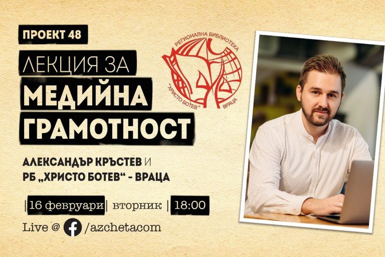 Първата лекция на тема медийна грамотност в рамките на „Проект 48” ще се проведе онлайн, съвместно с Регионална библиотека „Христо Ботев“ – Враца. Лектор на информативното събитие с отворен достъп ще бъде Александър Кръстев, създател на „Аз чета”, които заедно с Читалище.то са инициатори на проекта. Всеки с интерес към събитието може да гледа излъчването…