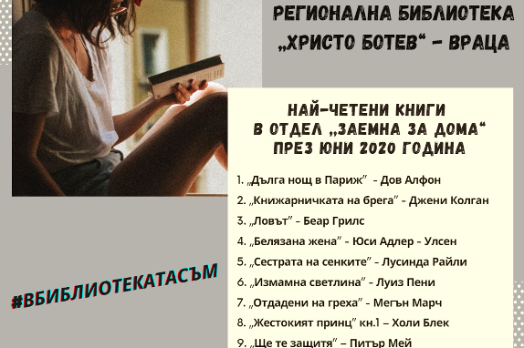 След кратка пауза отново ви представяме месечната ни класация за най-четените книги в отдел „Заемна за дома“ на Регионална библиотека „Христо Ботев“ – Враца. Вижте кои бяха най-предпочитаните заглавия за месец юни 2020 г. Още заглавия, налични в библиотеката, можете да потърсите в нашия интернет каталог на този уеб адрес: http://catalog-library.rimex-ltd.com/absw/abs.htm