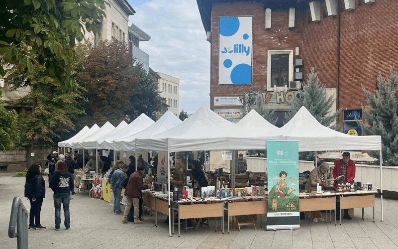 Пространството бе оформено с шатри, щандове и мобилна библиотека, превръщайки се в оживен книжен пазар и място за културен обмен.