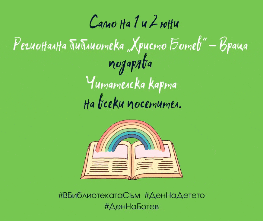 Всеки от посетителите на Регионална библиотека „Христо Ботев“ – Враца ще получи подарък едногодишна читателска карта от „Заемна за дома”, Детски отдел и филиал в ж.к. „Дъбника”. Инициативата е по случай 1 юни – Международен ден на детето и 2 юни – Ден на Христо Ботев и на загиналите за свободата и независимостта на България.
