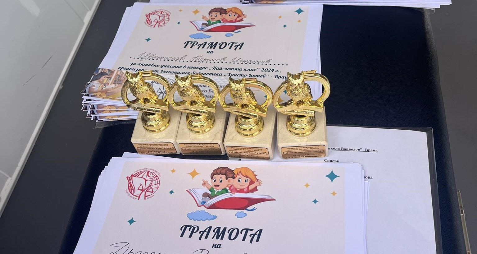 Статуетки с четящо бухалче, грамоти и книгоразделители с ваучери от Store.bg получиха първенците от I „в“ клас на СУ „Никола Войводов”, II „г“ клас на НУ „Иван Вазов”, III „в“ клас на НУ „Иванчо Младенов”и IV „a“ клас на СУ „Никола Войводов”. За всички класове имаше и грамоти за активно участие.