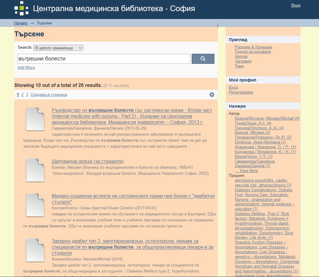 Уважаеми потребители, предлагаме на Вашето внимание дигитална колекция от електронни книги на Централна медицинска библиотека – София http://cml3.mu-sofia.bg:8080/xmlui/handle/10861/2.