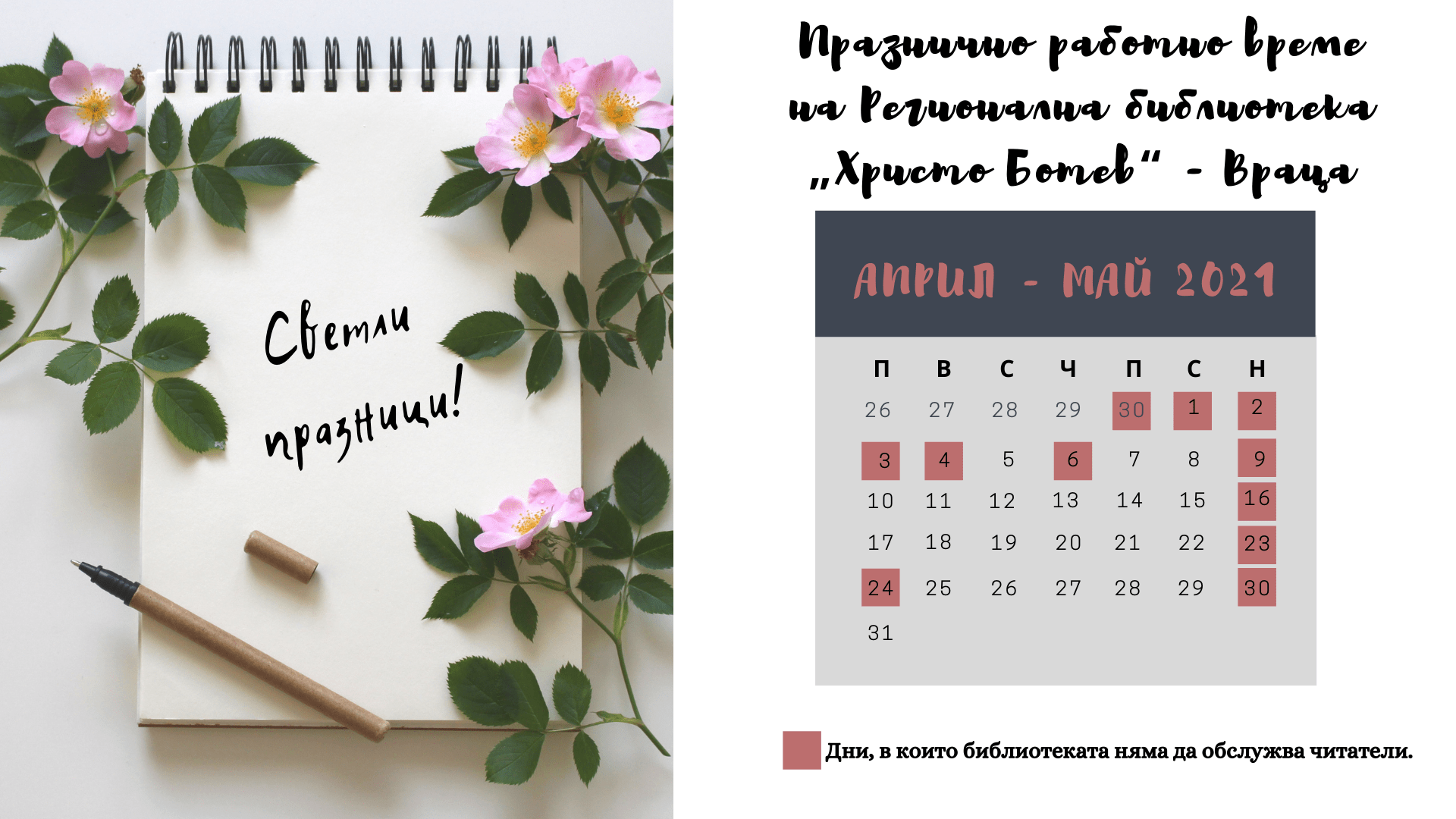 апр.262021Април 2021Без категорияНовини Вижте как ще работи библиотеката в дните около Великден и през месец май. Категории: Април 2021, Без категория, НовиниОт Регионална библиотека26 април 2021Тагове: работно време Споделете тази публикация Share on FacebookShare on Facebook TweetShare on Twitter Pin itShare on Pinterest Share on LinkedInShare on LinkedIn Автор: Регионална библиотека Публикация НавигацияПредишнаПредишна публикация:Милен Хальов: До края на годината излиза финалната книга от трилогията „Кало Змея“СледващаСледващата публикация:Най-четените книги през месец април 2021 г.Подобни публикацииРегионална библиотека „Христо Ботев“ – Враца отбелязва Деня на народните будители с интерактивни игри и специален абонамент29 октомври 2025Николай Табаков гостува във Враца29 октомври 2025Читателите на „Заемна за дома“ с нови карти и система за самообслужване28 октомври 2025Да растеш с увереност: Работилница за емоции „Самооценка и мотивация в детството“ в Регионална библиотека „Христо Ботев“ – Враца20 октомври 2025Важно съобщение от Детски отдел20 октомври 2025Костадина Костова представи романа си „Трифена“ във Враца15 октомври 2025