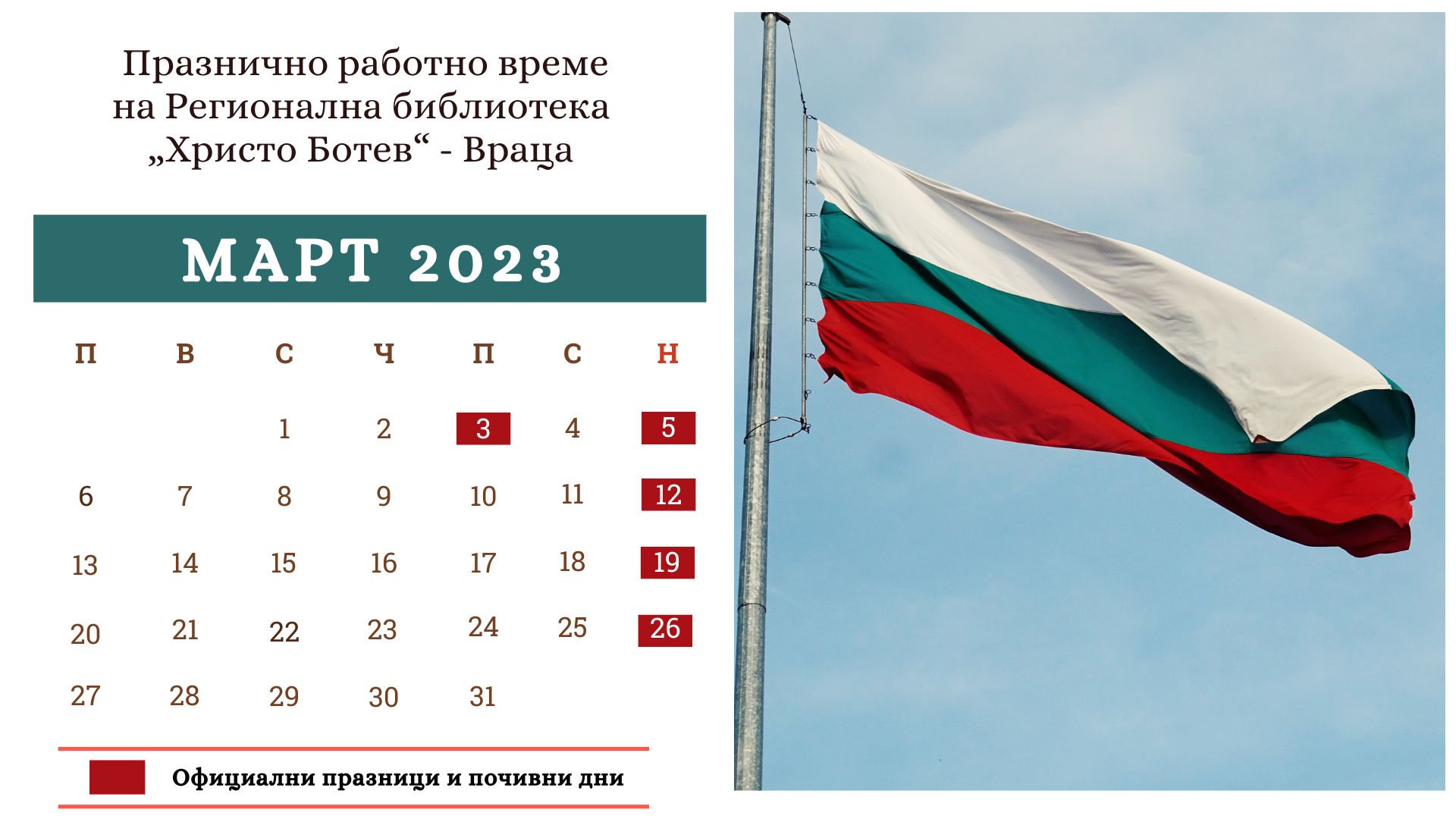 Приятели на книгите, вижте как ще работи Регионална библиотека „Христо Ботев“ – Враца през март 2023 г. Не забравяйте, че отдел „Заемна за дома“ ви очаква в събота от 9:00 ч. до 14:00 ч.