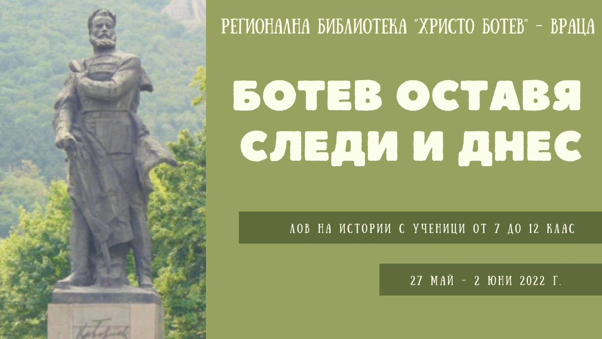 За втори път тази година Регионална библиотека „Христо Ботев“ – Враца организира игра, аналогична на „Лов на съкровища”, за учениците от 7 до 12 клас. Поради силния интерес на участниците от предишните издания на „Лов на истории“ по случай 3-ти март, библиотечните специалисти се заеха да направят една по-разширена и още по-забавна версия на играта, с която да отбележим Ботевите дни тази година. Играта “Ботев оставя следи и днес” е с предварително записване и ще се реализира в периода 27 май – 2 юни, а целта е учениците да научат любопитни факти за славния поход на Ботевата чета и да открият значими за историята на града ни места, за чието съществуване може и да не подозират. В продължение на 7 дни участниците ще се впуснат в „лов“ на факти и случки, разказани от съвременници на събитията от пролетта на 1976 год. Преминаването от една история към друга ще се случва след решаване на различни по характер загадки. От участниците не се изисква никаква предварителна подготовка, а само много любов към главоблъсканиците и умения за разгадаването им чрез модерните средства за комуникация и достъп до информация. А докато са по следите на историята от родния край, самите участници ще създават история – тяхната собствена, на преживяванията и перипетиите, през които преминават докато са по следите на Ботев и четата му.