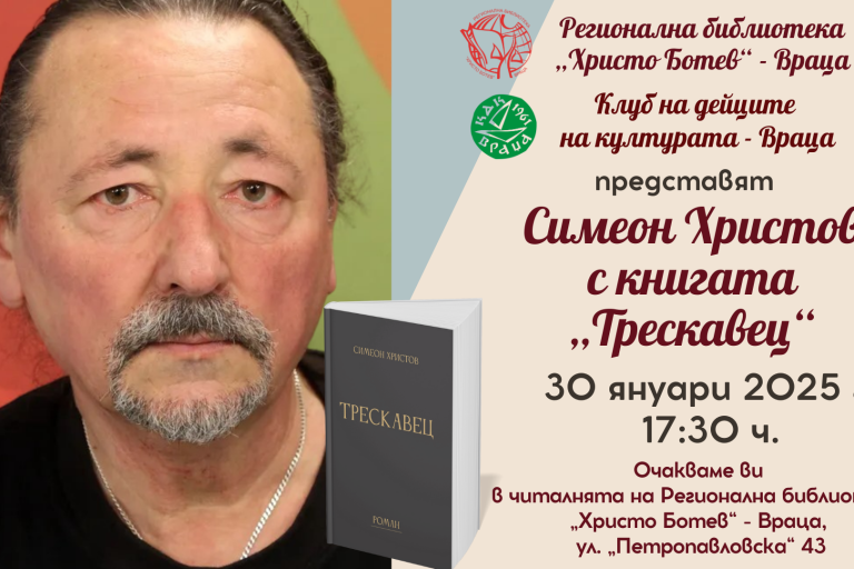Регионална библиотека „Христо Ботев“ – Враца и Клуб на дейците на културата – Враца представят Симеон Христов с романа „Трескавец“. Срещата ще се проведе на 30 януари 2025 г. в Читалнята на библиотеката, на ул. „Петропавловска“ 43. Главният герой на романа „Трескавец“ е млад духовник, който проповядва по нов начин и лекува хората. Той се опитва…