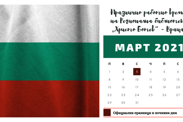 В сряда Регионална библиотека „Христо Ботев” – Враца няма да обслужва читатели, във връзка с Националния празник на България – 3 март. Очакваме ви отново в четврътък – 4 март 2021 г.