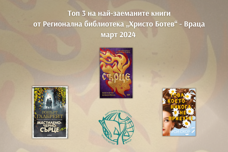 Топ 3 на най-четените книги от „Заемна за дома“ в Регионална библиотека „Христо Ботев“ – Враца през март включва: 📗„Сърце“ от Виктория БешлийскаРоман, който носи магията на „Глина“, но тупти със собствен пулс. „Сърце“ е история за онова, което държи всички ни цели. Стъпвайки на исторически факти, детайлно проучени географски местности, писмени извори и ръкотворни…